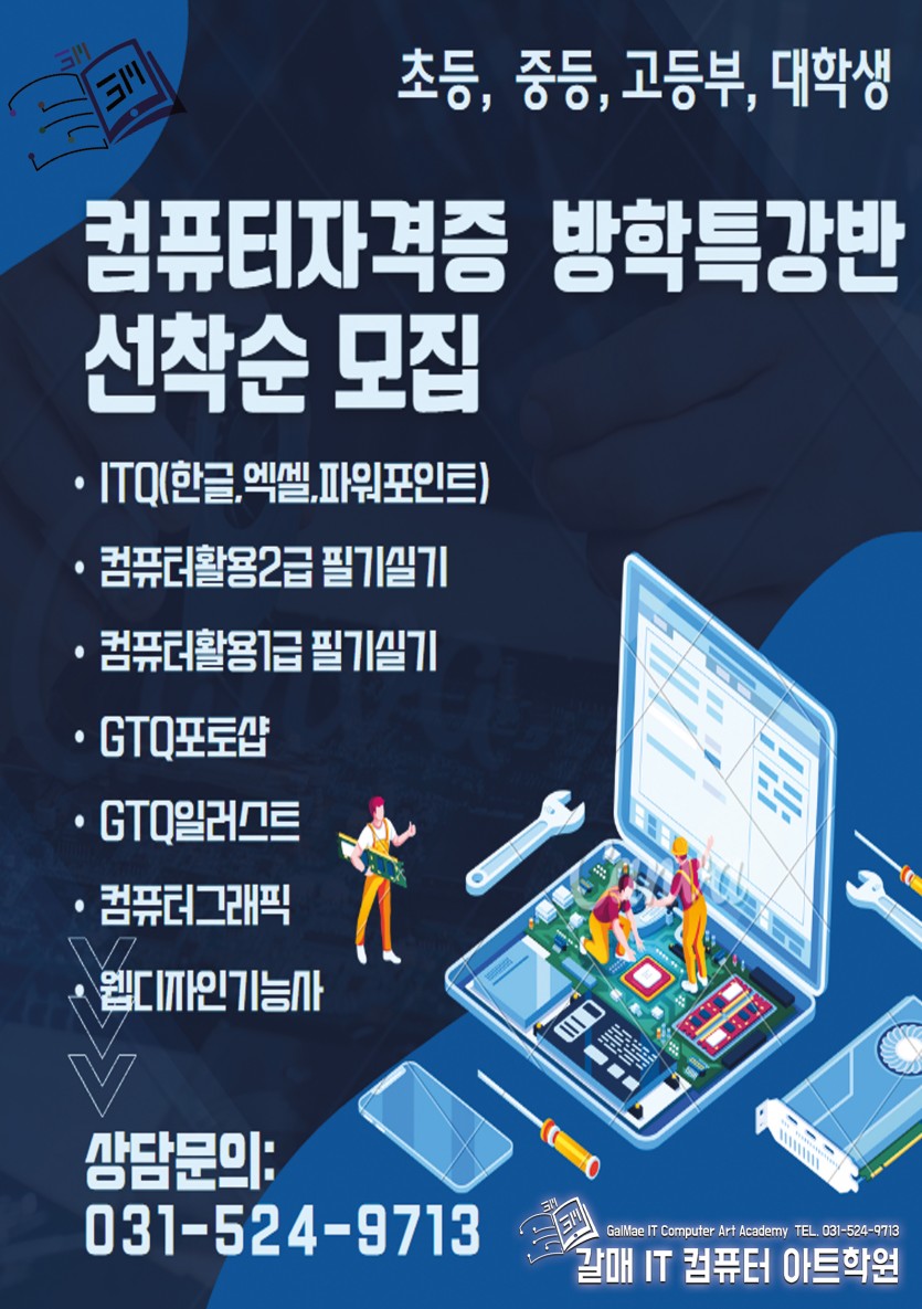 갈매IT_방학특강안내_6월_7월_8월 페이지 정보 작성자갈매IT컴퓨터아트학원 댓글댓글 0건 조회조회 229회 작성일 23-06-13 11:45 본문 방학특강안내 확인 후 전화주세요 목록